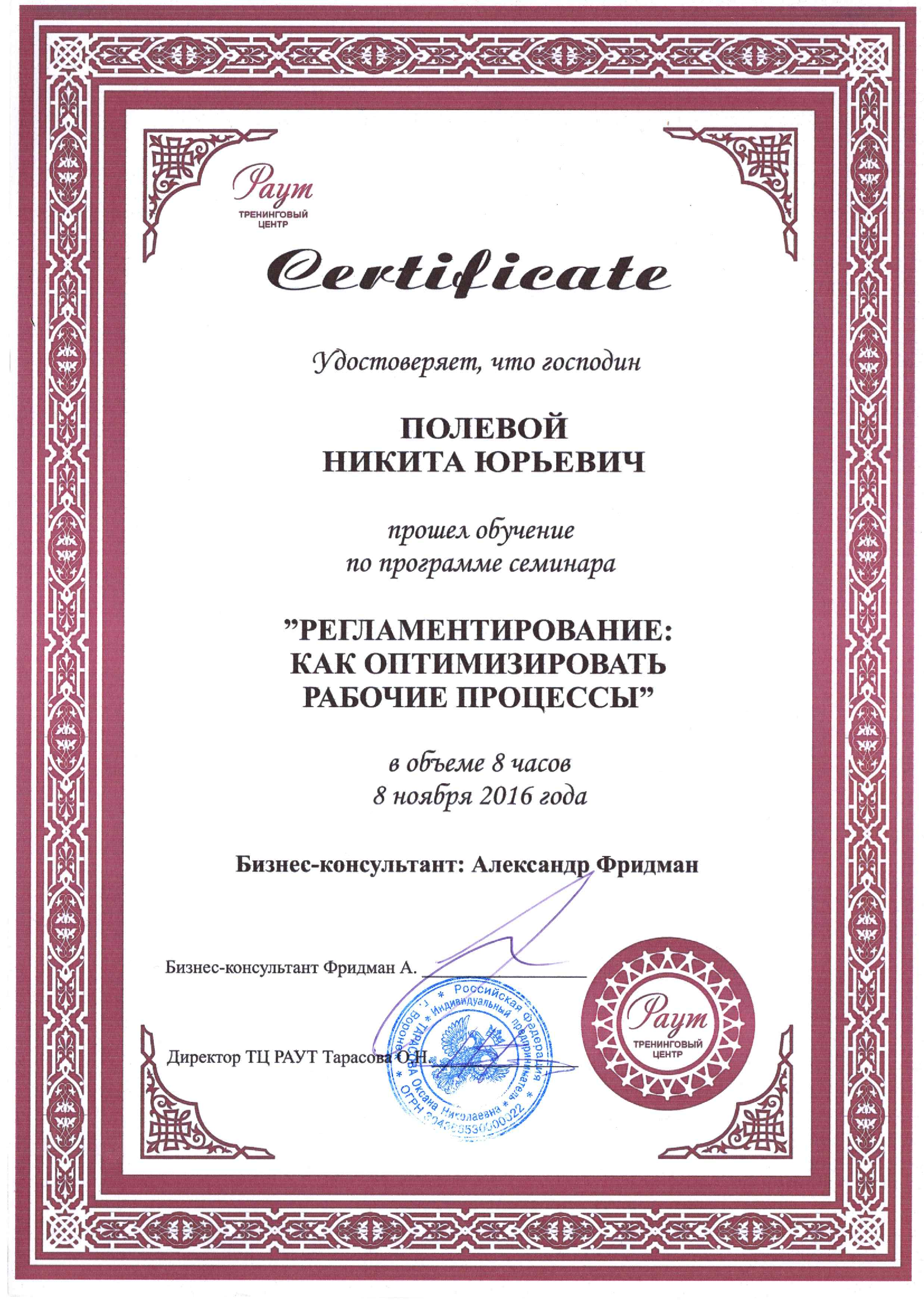 2016 год Сертификат о прохождении обучения. |