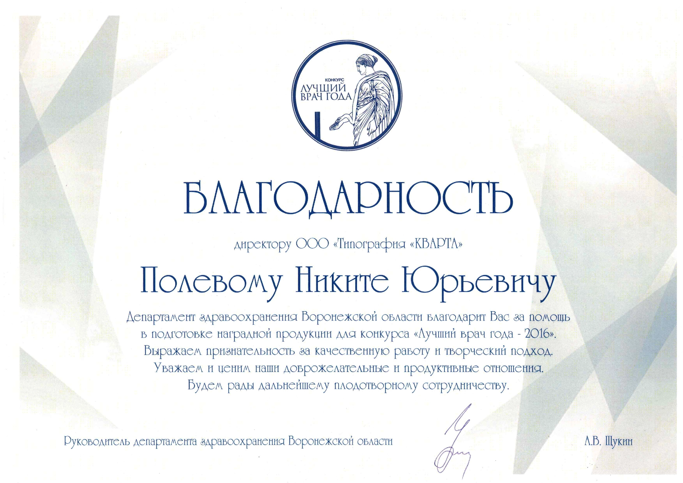 2016 год Благодарность за помощь в подготовке наградной продукции для конкурса "Лучший врач года - 2016". |