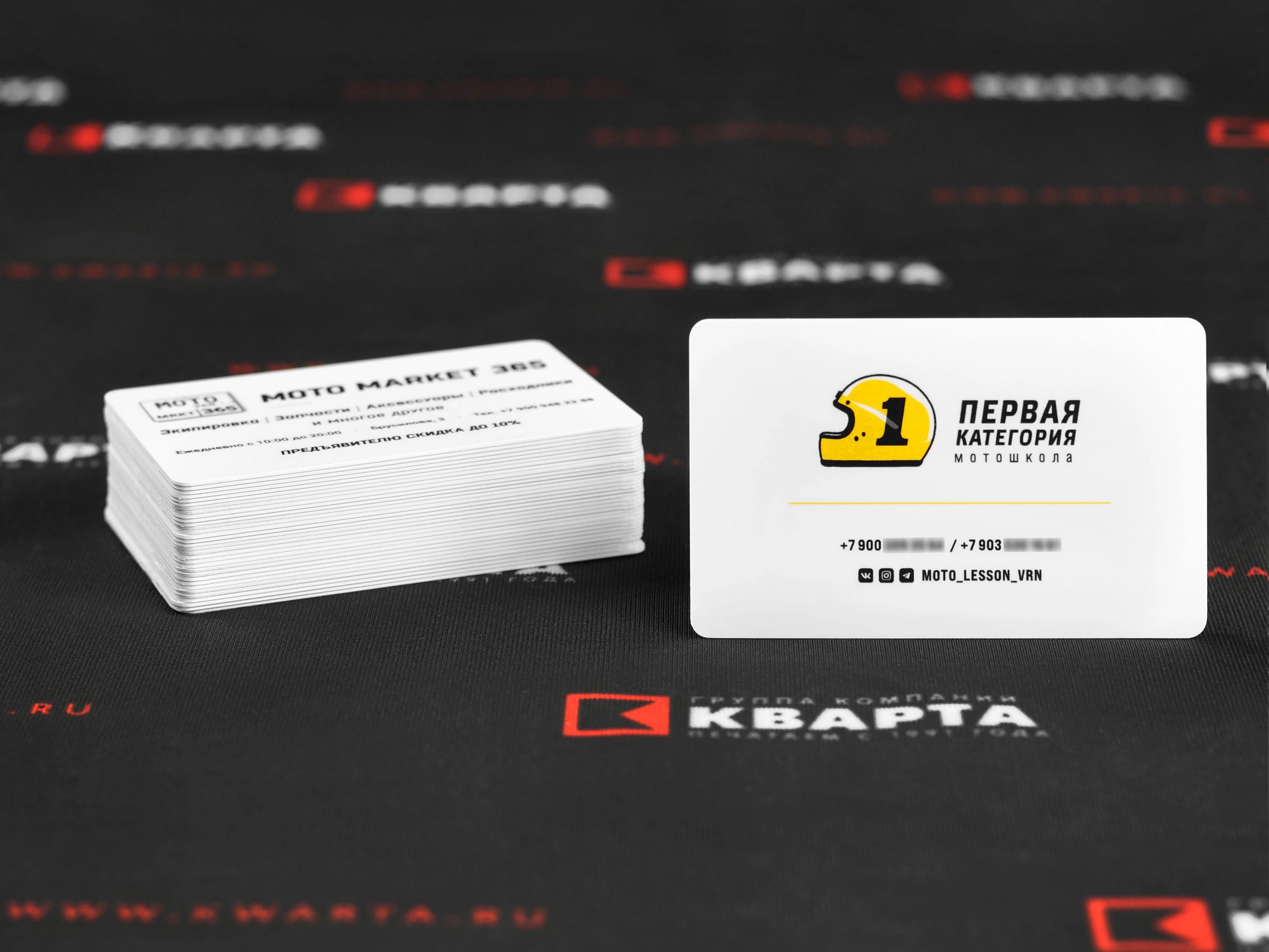 Пластиковые визитки для мотошколы "ПЕРВАЯ КАТЕГОРИЯ"