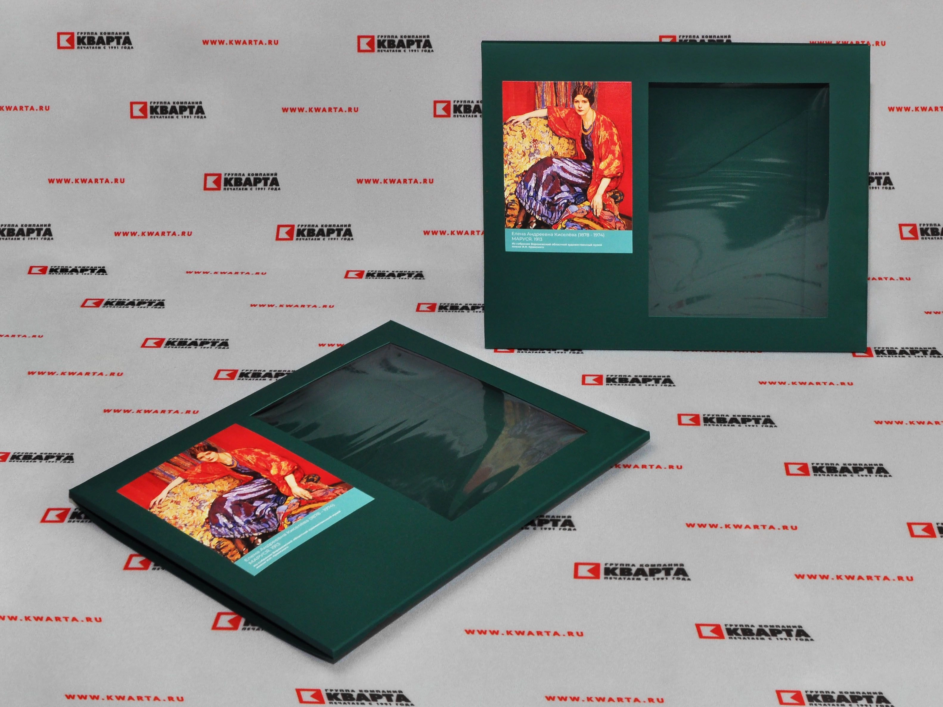 Конверт формата 685×410 мм выполнен из высококачественной бумаги Plike (Плайк) зелёного цвета плотностью 330 г/м². Материал отличается прочностью и матовой бархатистой текстурой.